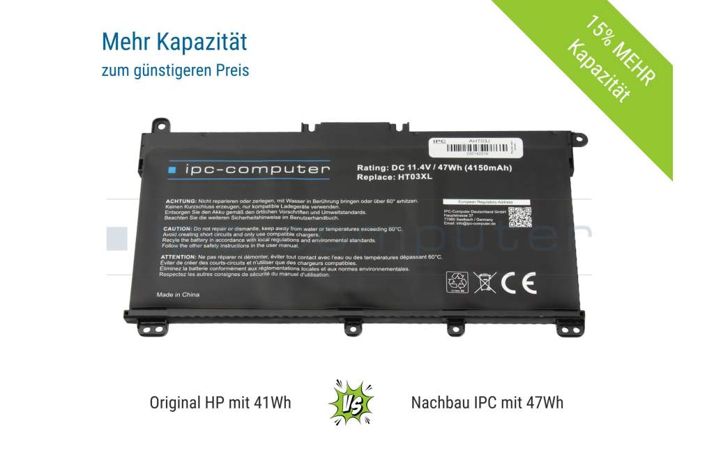 Achtung: HT03XL 3 Zellen Akku - In der Modellreihe HP 15-cs1000, 15-cs2000, 15-cs3000 werden je nach Ausstattung Akkus mit unterschiedlicher Bauform verbaut. Vergewissern sie sich bitte vor Kauf, dass es sich bei Ihrem Akku um das Modell HT03XL handelt. Dieser hier angebotene Akku kann nicht als Alternative zu dem HP Akku LG04XL verwendet werden!