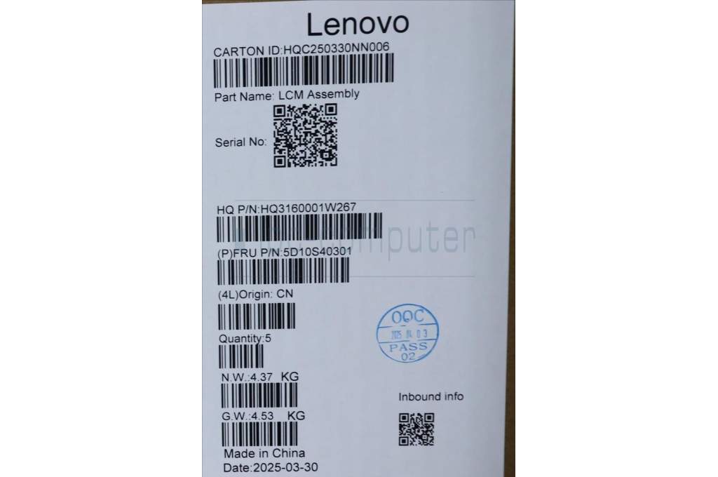 Lenovo 5D10S40301 Lenovo LCD Module, 16", 2.8K, Touch, Glare, OLED, 500nit, 100%DCI-P3, Luna Grey