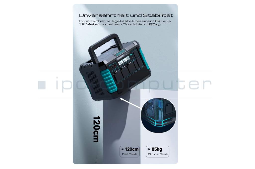 • Bruchsicher: Falltest aus 1,20 m • Druckfest bis 85 kg
